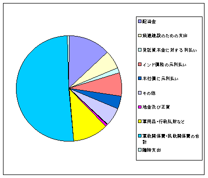 本国費の40パーセント近くが軍事関係費である。(本国費以外も入れると50パーセントを超える)それ以外に注意すべき事は鉄道施設の費用だろう。
